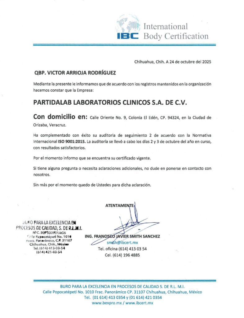 En Partidalab Laboratorios nos enorgullece compartir con todos nuestros pacientes, colaboradores, proveedores y público en general que hemos renovado con éxito nuestra certificación bajo la Norma Internacional ISO 9001:2015, tras haber concluido satisfactoriamente la auditoría de seguimiento 2025